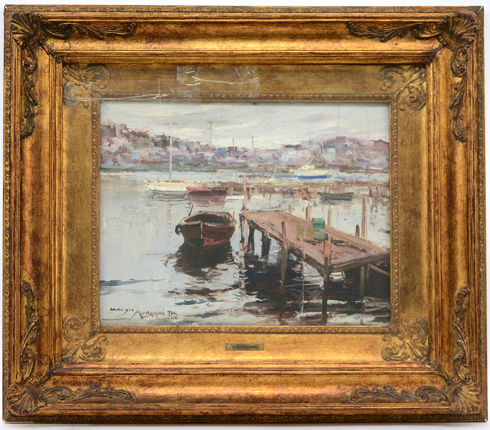 Claudio Morgigno Napoli 1949 "Il molo", olio su tela (cm 33x43) firmato e...