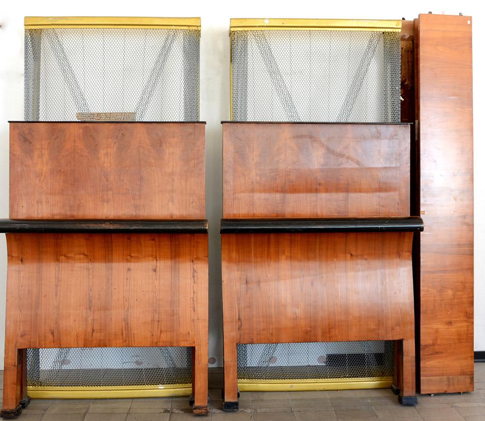 Coppia di letti impiallacciati in ciliegio con testata lineare, pediera arcuata, elementi terminali ebanizzati e piedi a plinto, completi di rete. Anni '30 ca. del secolo XX (difetti e mancanze)