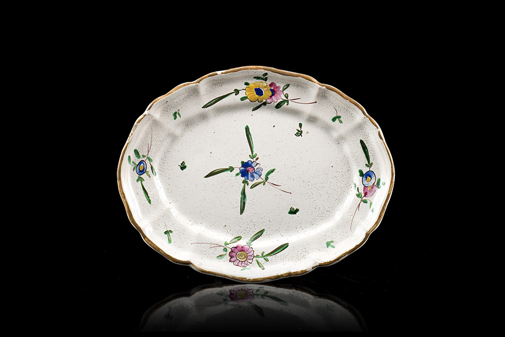 Piccolo piatto ovale in maiolica mistilineo con decoro policromo a piccoli fiori. Profilo in bruno. Sec. XVIII/XIX (cm 19,5 x 15) (difetti di cottura)
