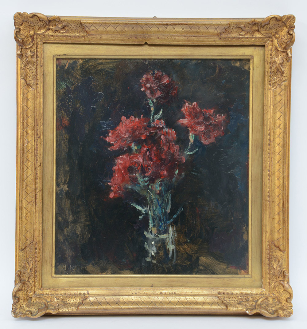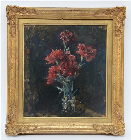 Arturo Rietti Trieste 1863 Padova 1943 (Attribuito) "Fiori rossi" olio su cartone (cm 36.5x33)Firma incisa in basso a sinistra. In cornice