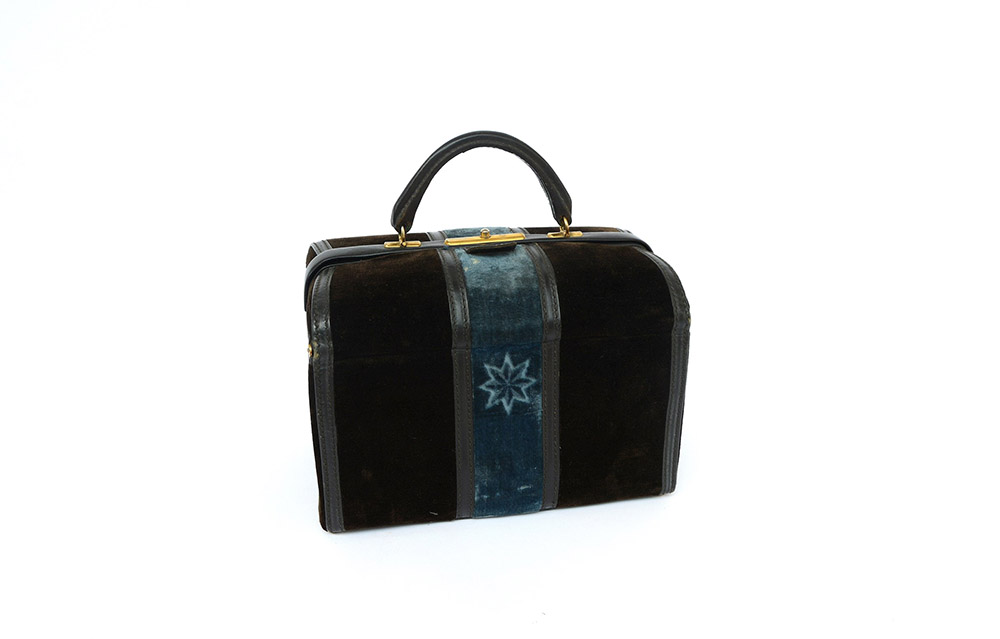 ROBERTA DI CAMERINO Beauty case in pelle nera con bande in velluto nero e acquamarina (cm 30)(difetti e segni d'uso)