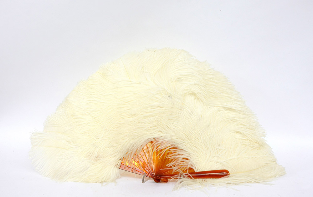 Scatola contenente grande vendaglio in piume di struzzo bianche e bachelite...
