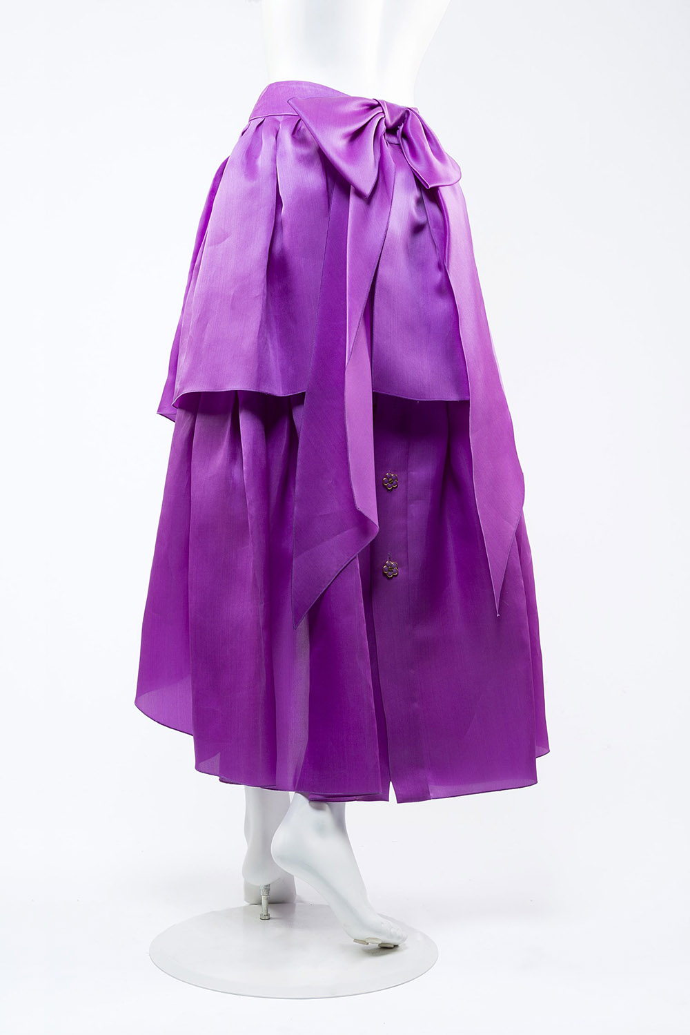 CHANEL Gonna longuette in organza di seta color glicine con spacco sul retro e grande fiocco, bottoni gioiello logati (tg 40) CHANEL A longuette mauve silk organza skirt (size EU 40)