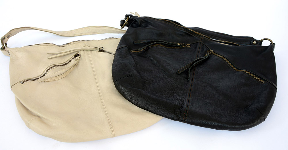 MIKI THUMB Lotto di due borse capienti in pelle morbida, forma a sacco, tracolla, chiusura con cerniera; una color panna l'altra nera (cm circa 43) (difetti e segni d'uso)
