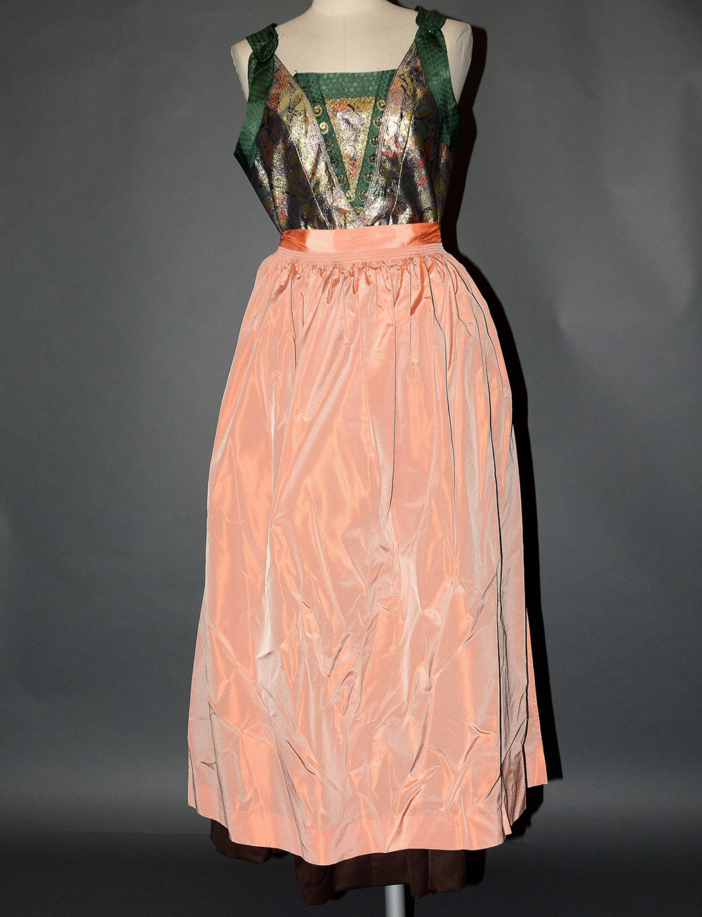 Direndl composto da gonna in lanetta e corpino in lamé con grembiule in seta...