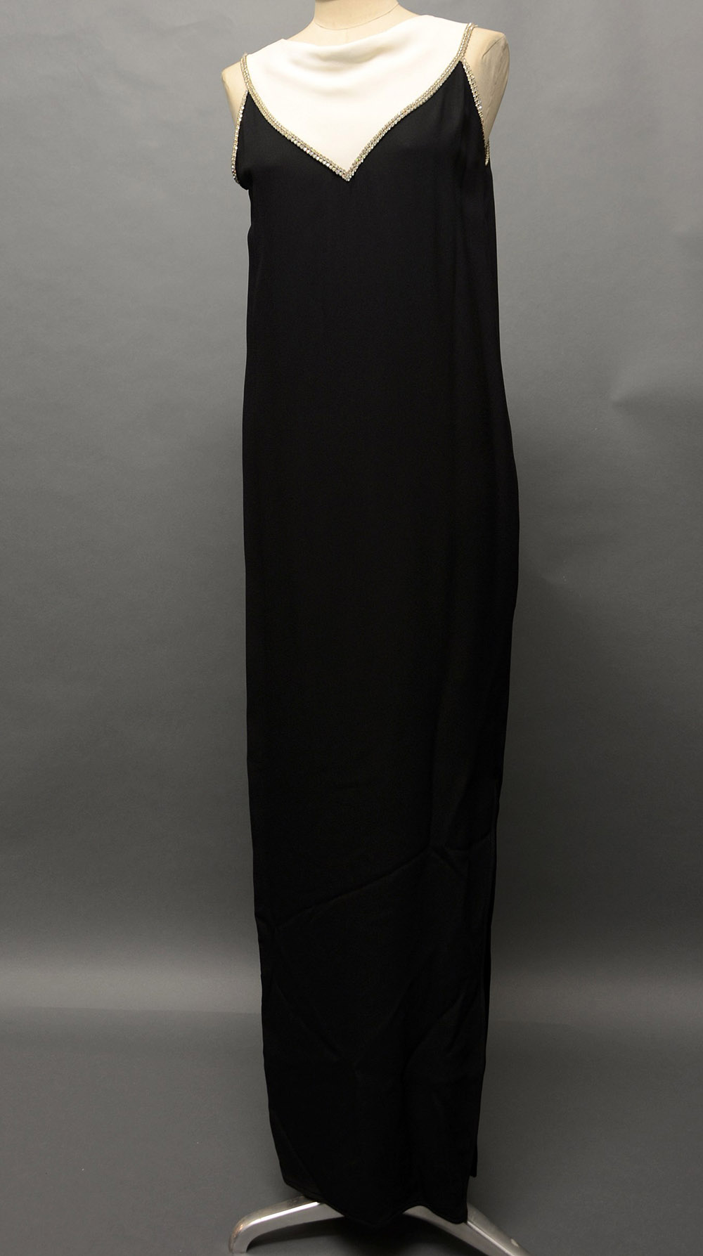 VALENTINO BOUTIQUE Vestito nero smanicato a tunica con bavero bianco bordato di strass
