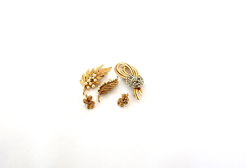 TRIFARI Lotto di tre spille e un paio di orecchini in metallo color oro il tutto rifinito con pietre incolori e perle fancy (difetti e mancanze)