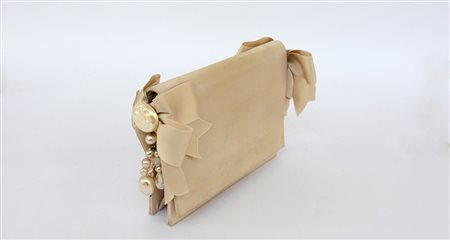 CHRISTIAN DIOR - PARIS Pochette a busta in gros di seta decorata sui due lati con fiocco in raso e perle fancy (cm 22) (difetti e segni d'uso)