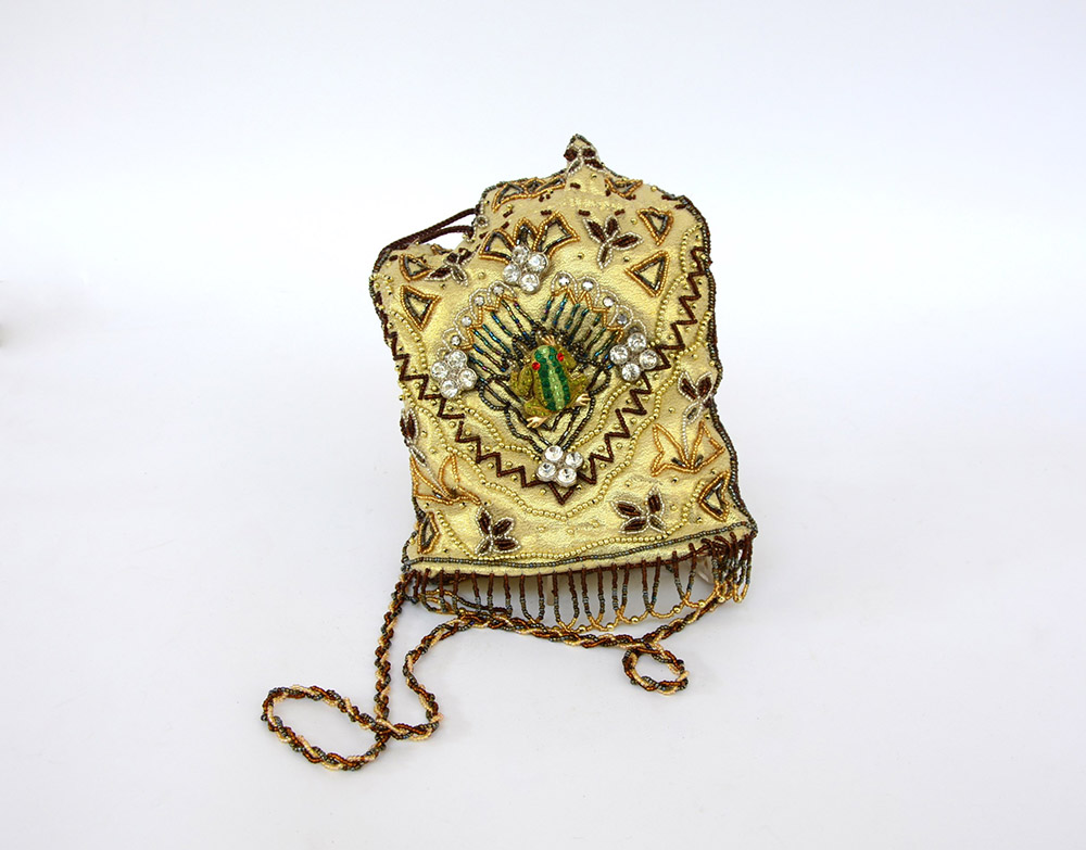 Borsa a sacchetto in tessuto lamé con ricami e lunga tracolla di perline, centrata da una piccola rana in rilievo (cm 17) (difetti)
