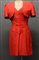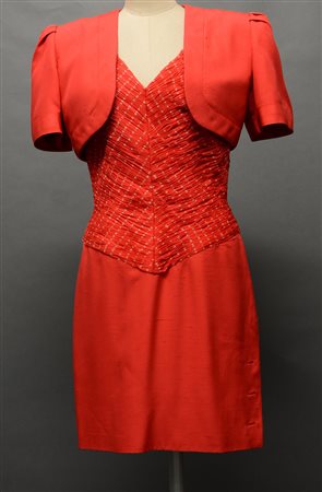 VALENTINO Vestito in shantung e chiffon rosso, corpino gofrrato a micro-pois bianchi, coprispalle in shantung (tg 38/40)