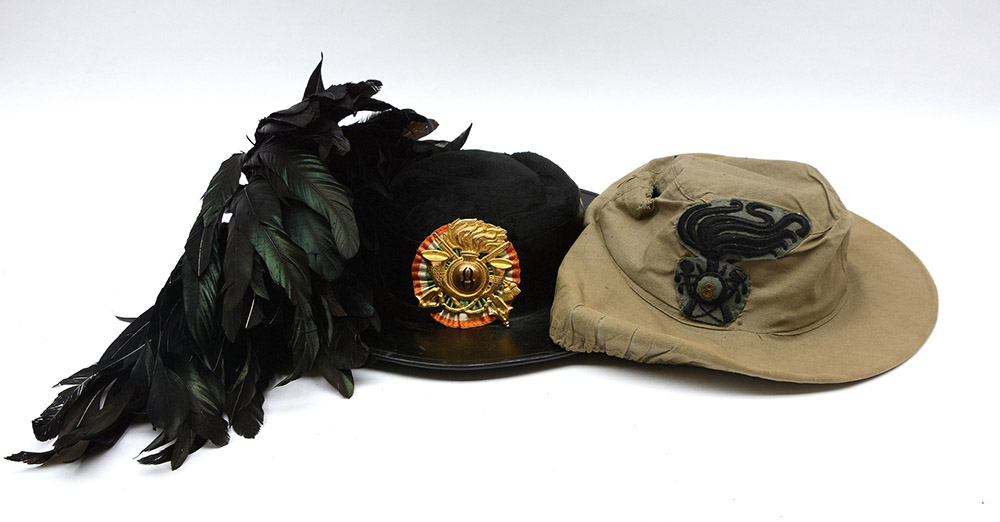 Lotto composto da un moretto da ufficiale dei bersaglieri dell'8° Reggimento con piumetto comprensivo del telino da campagna in color cachi e fregio antiriflesso. Italia, anni '30