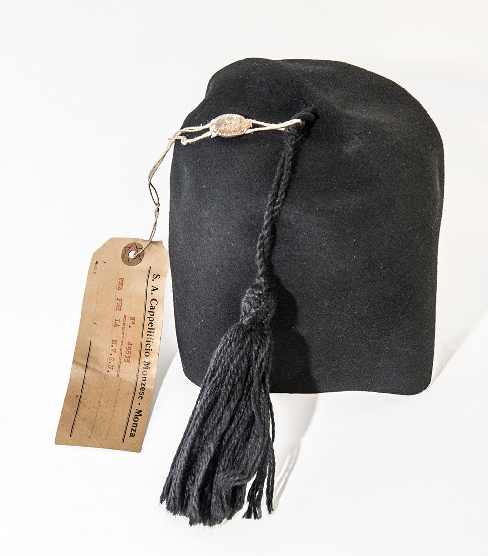 Fez fascista da truppa prodotto da Cappellificio Monzese per la M.V.S.N., con etichetta d'origine e numerazione. Italia, 1939