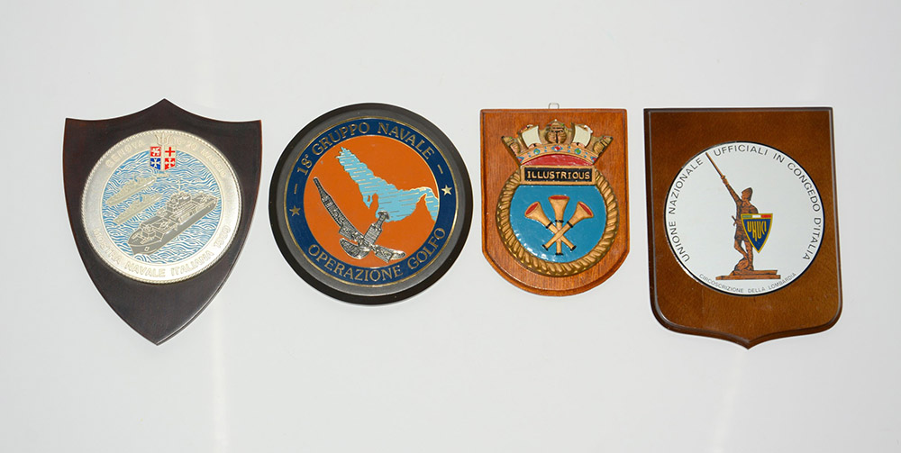 Lotto composto da quattro crest (insegne reggimentali) in metallo smaltato su base lignea