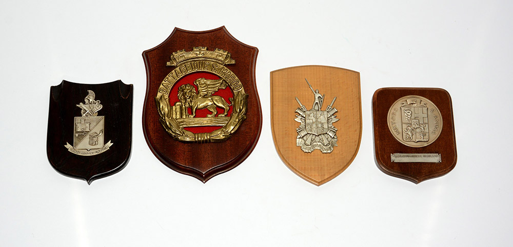 Lotto composto da quattro crest (insegne reggimentali) in metallo smaltato su base lignea