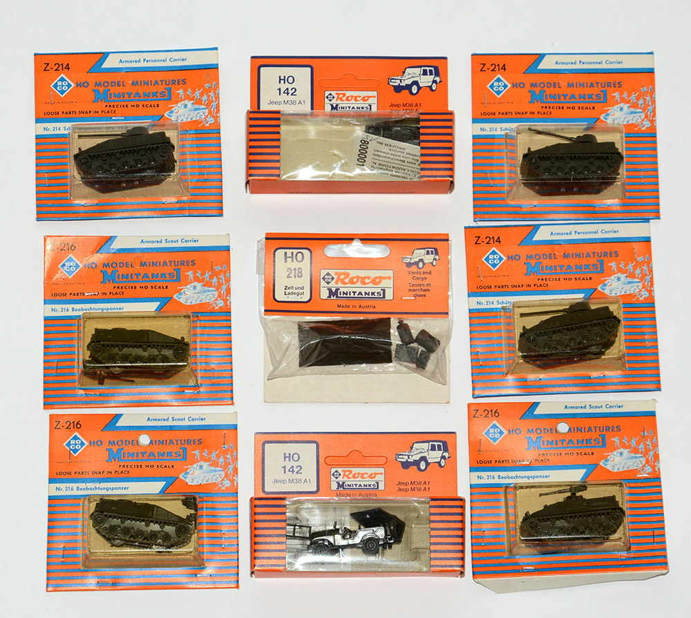 Lotto composto da otto modellini militari in plastica, prodotti dalla Rocco Minitanks in Austria. Nelle scatole originali