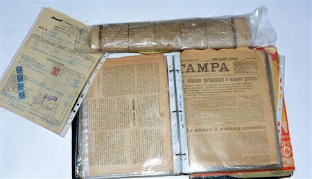 Lotto composto da un raccoglitore contenente varie pubblicità, cartoline, etichette ed altro materiale dell'inizio del sec. XX unito ad un giornale listato a lutto per la morte di Garibaldi del 1882