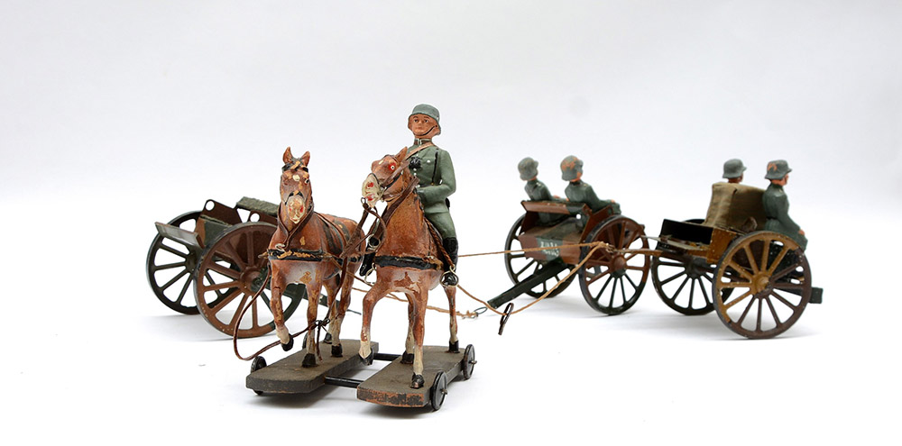 Raro lotto di tre carriaggi militari con quattro serventi e una coppia di cavalli da traino con servente. Discrete condizioni conservative. Germania anni '30/'40