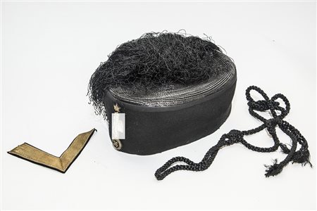 Fez fascista della Milizia Universitaria. Raro modello estivo con parte in paglia e fregio della 26° Legione unito a gradi e cordelle. Italia, 1935