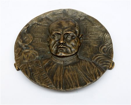 Placca ad altorilievo in bronzo raffigurante Benito Mussolini. Italia, ventennio (d cm 13.5)