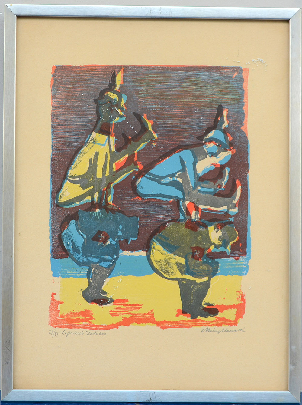 Mino Maccari Siena 1898 Roma 1989 "Capriccio tedesco" linoleum a colori (foglio cm 44x32,7)numerato 27/89, titolato e firmato in basso in lapis. In cornice (lievi difetti)