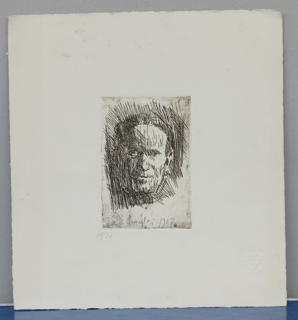 Pio Semeghini Quistello 1878 Verona 1964 "Autoritratto" acquaforte postuma (lastra cm 13,7x9,4 foglio cm 31x28,3) firmata e datata in lastra, numerata 18/20 in basso a sinistra a matita e timbro a secco "Stamperia del Cappello, Verona" in basso a destra. Dedica al retro della figlia.