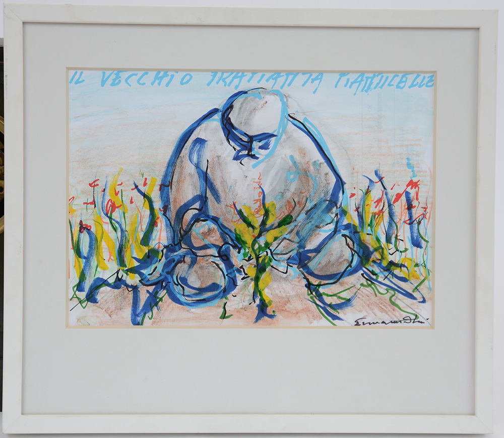 Ermanno Olmi Bergamo 1931 "Il vecchio trapianta pianticelle" tecnica mista su carta (cm 21x29,5)titolato in alto, firmato in basso a destra. Al retro etichetta Sotheby's. In cornice