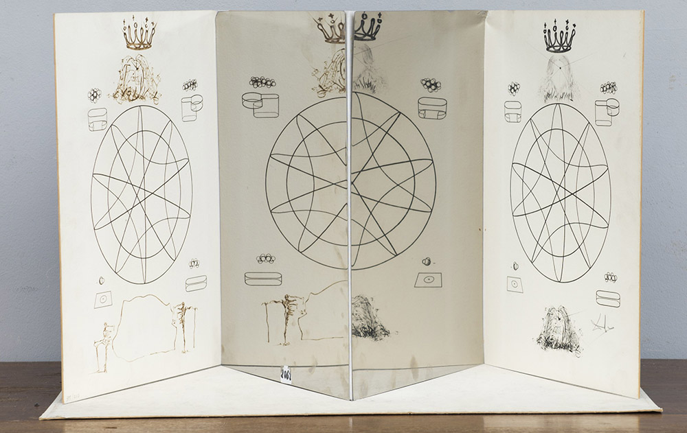 Dalì Salvador Figueras 1904 1989 "Composizione" Multiplo con effetto stereoscopico formato da una puntasecca e un' incisione, montate su cartone con lastre di alluminio a specchio. Contenuto in teca di plexiglass e legno. Esemplare 98/210, firmato a matita e numerato (cm 60x42x41)(mancante della teca e della base, difetti)