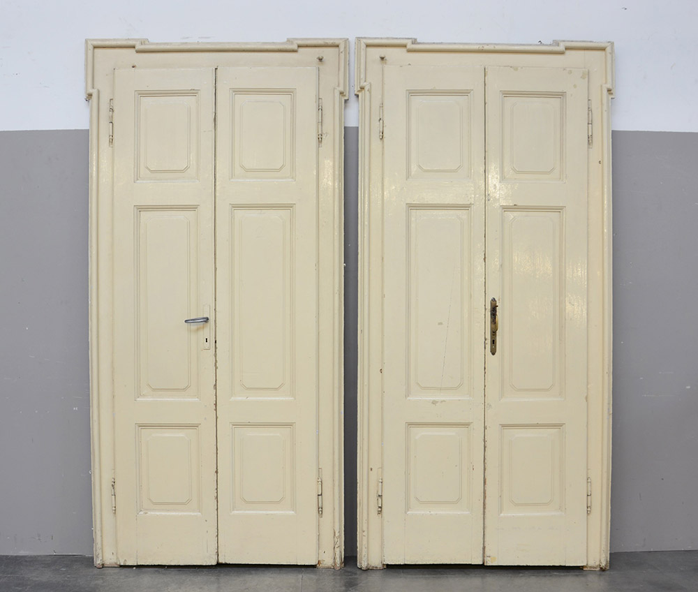 Due porte a due battenti con stipiti in legno laccato con ante riquadrate e...