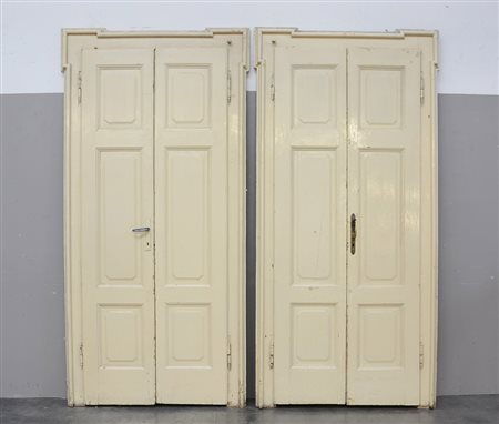Due porte a due battenti con stipiti in legno laccato con ante riquadrate e pannellate (cm 247x123)(difetti)