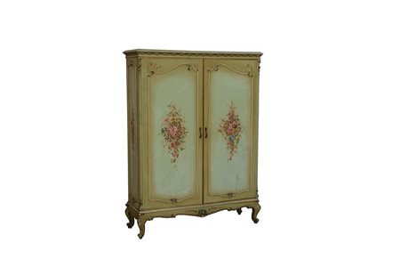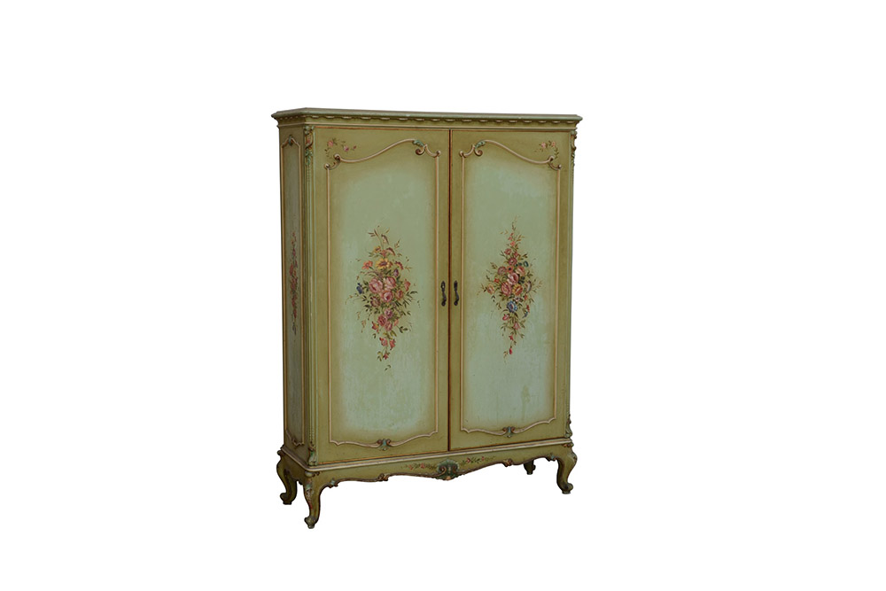 Piccolo armadio a due ante in legno laccato a fondo verde, dipinto in policromia a motivi floreali. Piedi, fascia e montanti intagliati (cm 114x152x39) (difetti)