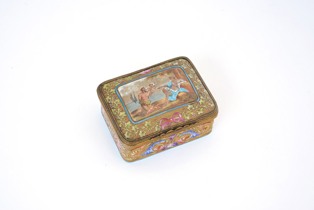 Scatola in porcellana decorata in policromia con ghirlande vegetali e, sul coperchio, da dipinto miniato a soggetto mitologico. Cerniere in metallo dorato. Marca di fabbrica, Francia (?), (cm 4 x 8,5 x 6,5) inizi sec. XX (lievi difetti)