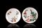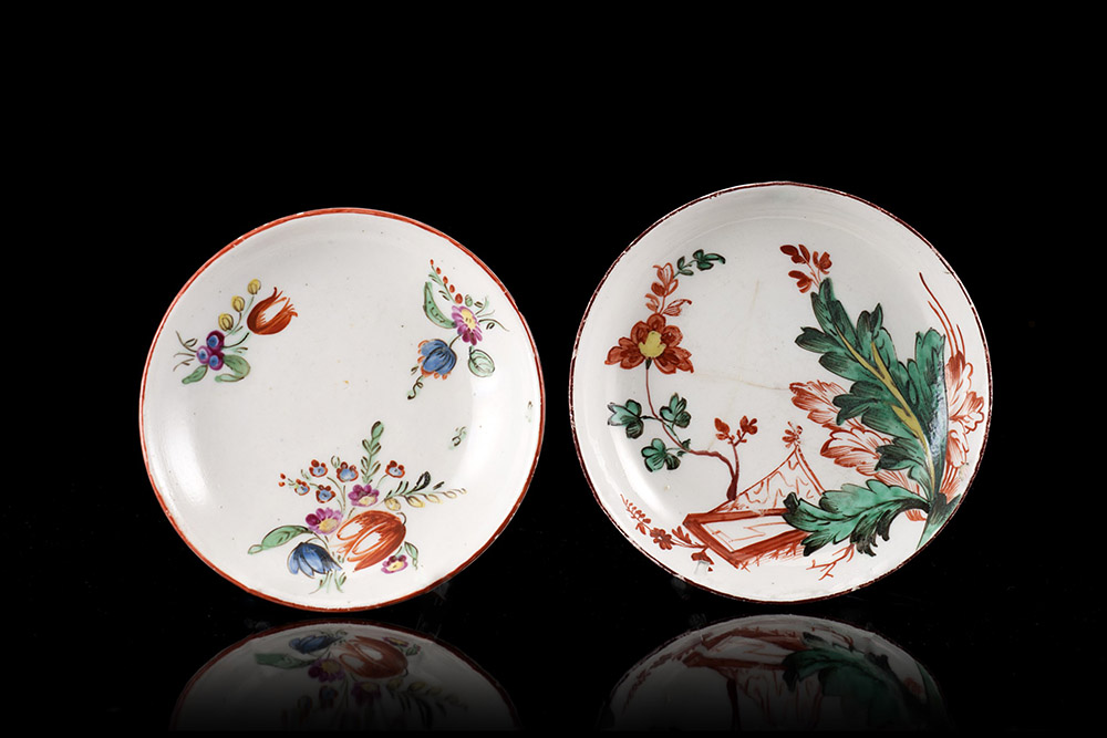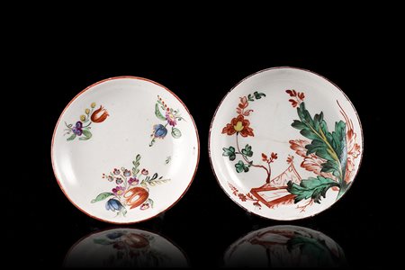Due piattini da caffè tondi a bordo liscio in porcellana. Uno con decoro a mazzetti di fiori policromi e profilo in rosso. Doccia, manifattura Ginori, sec. XVIII/XIX (d. cm 11). L’altro dipinto in rosso e verde con motivi vegetali ‘a foglia di tabacco’. Profilo in bruno (d. cm 11,6). Venezia, sec. XVIII (usure e felature)