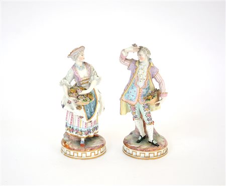 Coppia di statuine in porcellana decorate in policromia raffiguranti rispettivamente dama in vesti di contadinella e nobiluomo in abiti settecenteschi. Marca di fabbrica in blu. Sec. XIX/XX (h. cm 19) (piccoli difetti)