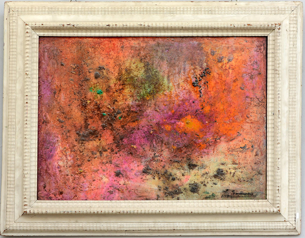 Firma indecifrata "Senza titolo" 1964 tecnica mista su masonite (cm 50x70) firmata e datata in basso a destra, in cornice (difetti)
