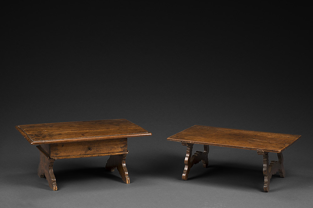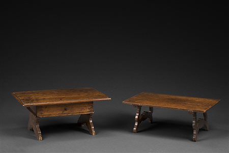 Due vassoi da letto, uno in noce con gambe sagomate e traforate, l'altro in legni vari con cassetto nella fascia e gambe sagomate. Sec. XVII (misure diverse, lievi difetti) Provenienza: Nella Longari Antichità, etichetta nella fascia Two 17th-century wooden bed trays (defects)