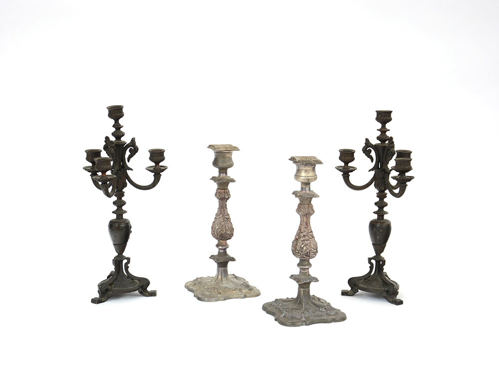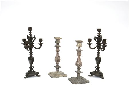 Lotto composto da una coppia di candelabri e tre fiamme in metallo brunito e una coppia di candelieri in metallo chiaro (h cm 38 e 30)