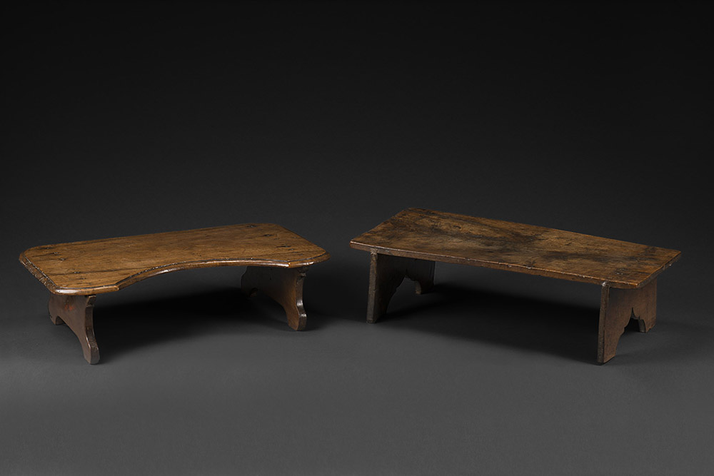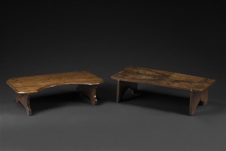 Due tavoli-vassoio da letto in noce, uno con piano mosso, sec. XVII (misure diverse) (difetti) Lot comprising two 17th-century walnut bed trays (defects)
