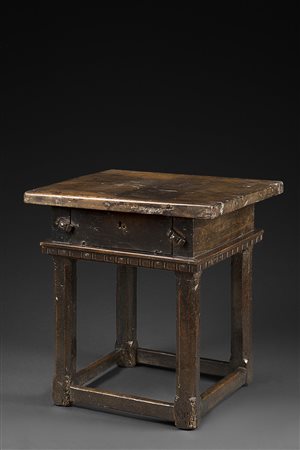 Tavolino basso da lavoro di forma rettangolare. Antina ribaltabile nella fascia, gambe sfaccettate unite da traverse. Sec. XVII (cm 65x67x58)(difetti e mancanze) Provenienza: Nella Longari Antichità, etichetta cartacea 17th-century rectangular wooden table (defects and losses)
