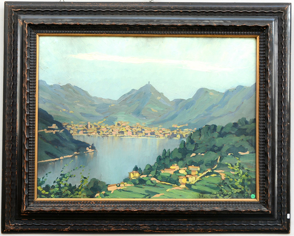 Fontana Daniele Milano 1900 1952 "Como da Cernobbio" olio su compensato (cm 60x80) firmato in basso a destra, in cornice a decoro guillochè (difetti)
