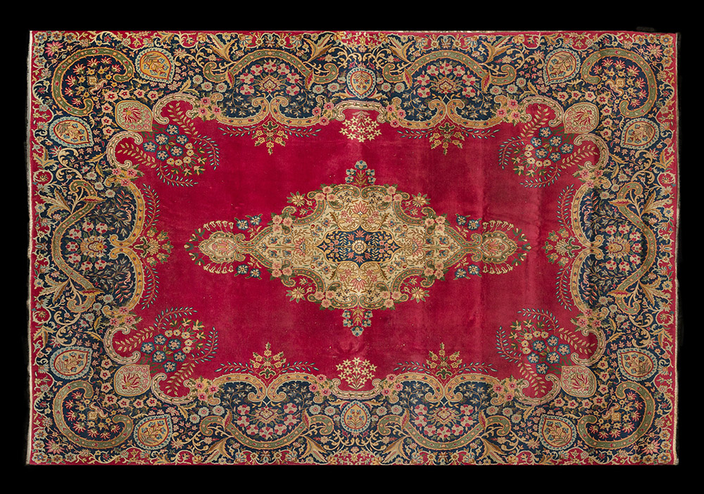 Tappeto Kirman, Persia secolo XX. Disegno floreale con medaglione in policromia su fondo rosso ciclamino (cm 395x287) (difetti)