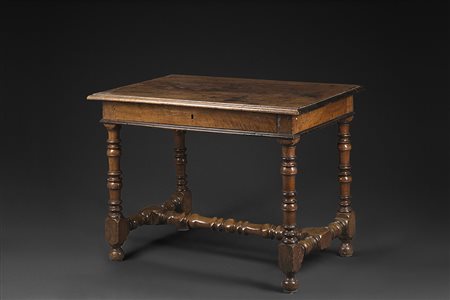 Tavolo da centro in noce con cassetto nella fascia. Gambe e traversa tornite a rocchetto. Emilia, sec. XVII (cm 110x80x73)(difetti e restauri) 17th-century burr walnut veneered table (defects and restorations)