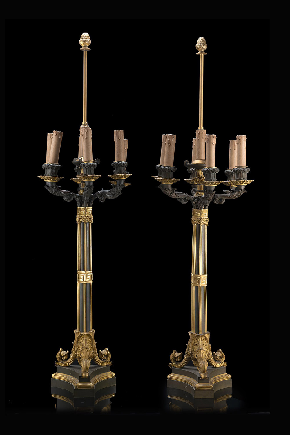 Coppia di candelieri a cinque fiamme in bronzo brunito e dorato con braccia sagomate e cesellate a volute fogliate. Base a colonna esagonale poggiante su piedi a ricciolo con mensola sagomata. Sec. XIX (h. cm 64)