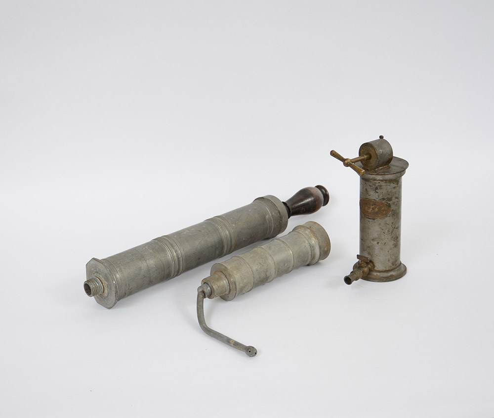 Lotto composto da un irrigatore e due elementi di irroratore e stantuffo (cm 23 e 75) (difetti e mancanze)