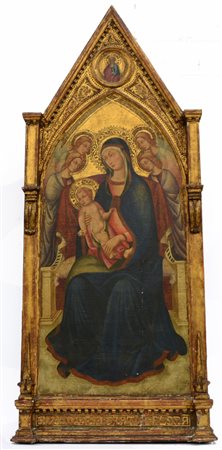 Tavola raffigurante la "Madonna in Maestà con Bambino e angeli" con cornice a tempietto in stile pre-rinascimentale, secolo XX (cm 142x62) (difetti)
