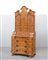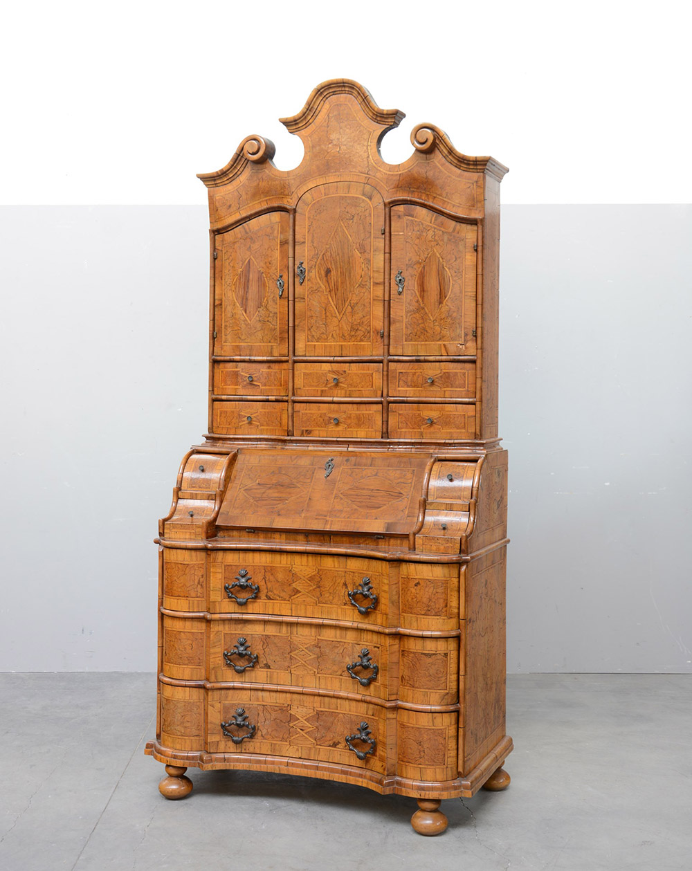 Mobile a due corpi lastronato in noce e radica di noce con parte inferiore a tre cassetti, calatoia celante vani e cassettini, parte superiore a sei cassetti e tre sportelli sovrastanti, cimasa mossa. Veneto, inizio sec. XX (cm 101x224x55) (lievi difetti)