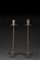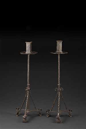 Coppia di antichi portaceri in ferro battuto con montante a torciglione; base...