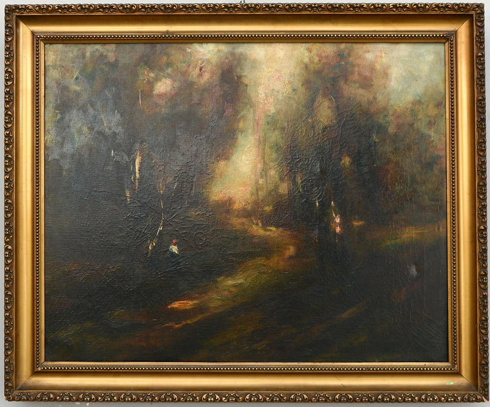 Pobbiati Mario Milano 1887 1956 "Figura nel bosco" olio su tela (cm 80x100) firmato in basso a destra, in cornice (difetti)