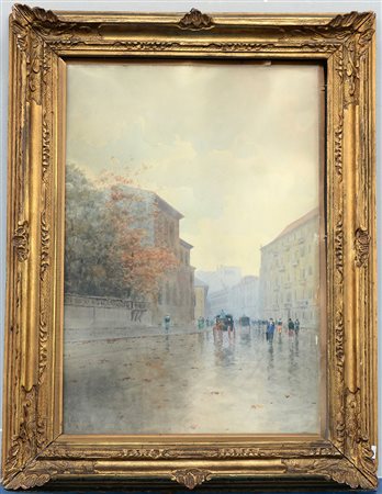 Firma indecifrata, "Scorcio di Parigi", acquerello su cartoncino (cm 48x35)...