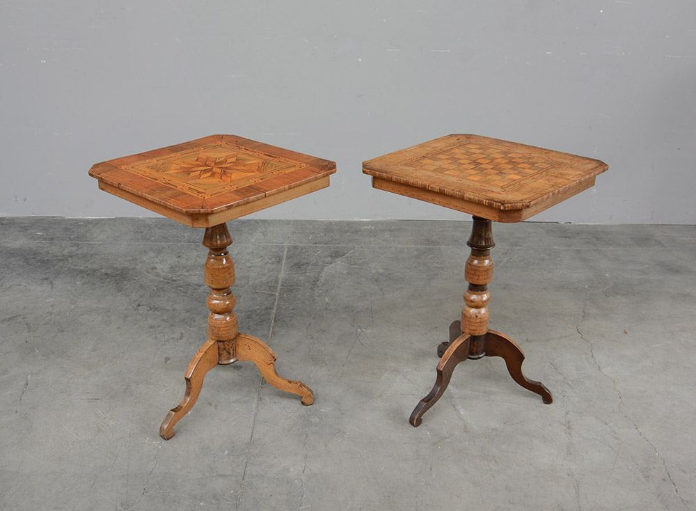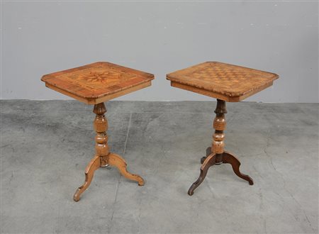Due tavolini tripodi in legno intagliato con colonna tornita, piano ad angoli smussati, uno con intarsio a scacchiera, l'altro con rosa dei venti, sec. XIX (cm 50x70x50) (difetti e mancanze)