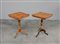 Due tavolini tripodi in legno intagliato con colonna tornita, piano ad angoli...